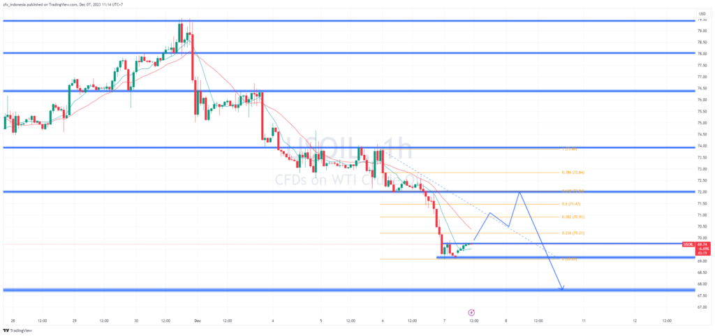 Oil prices continue to weaken, especially after breaking out support at 72 and have now formed a lower low in the 70 area. With a retracement that has the potential to end at the same key level; 72 at the same time at Fibonacci 61.8%, there is still potential that oil prices will weaken again to 68.75 which is the inverse Quasimodo H4 area as a demand area. Oil prices themselves will continue to be bearish as long as they do not create a new higher high above 74.
